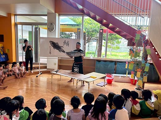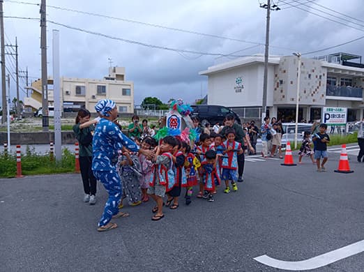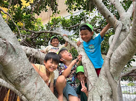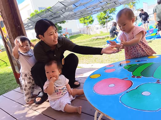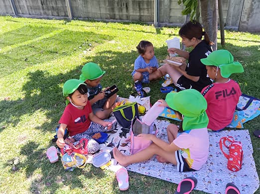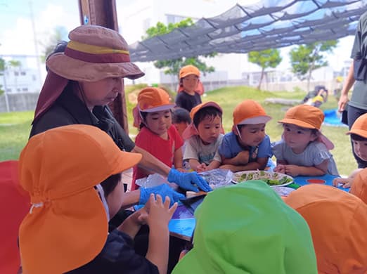 - 専門の栄養士や調理師がメニューを考え、園内の給食室で毎日手作りの給食を作っています。献立もバラエティに富み、「洋風」「和風」の他「うちなー料理」等いろいろなメニューを味わうことができるよう工夫しています。